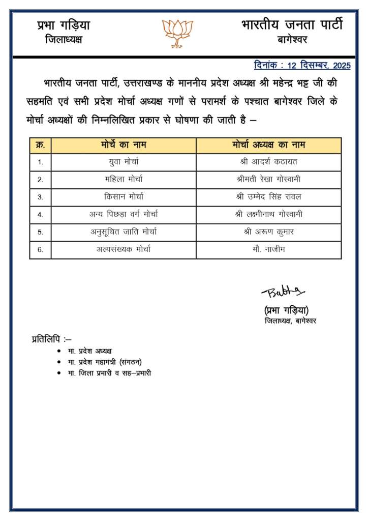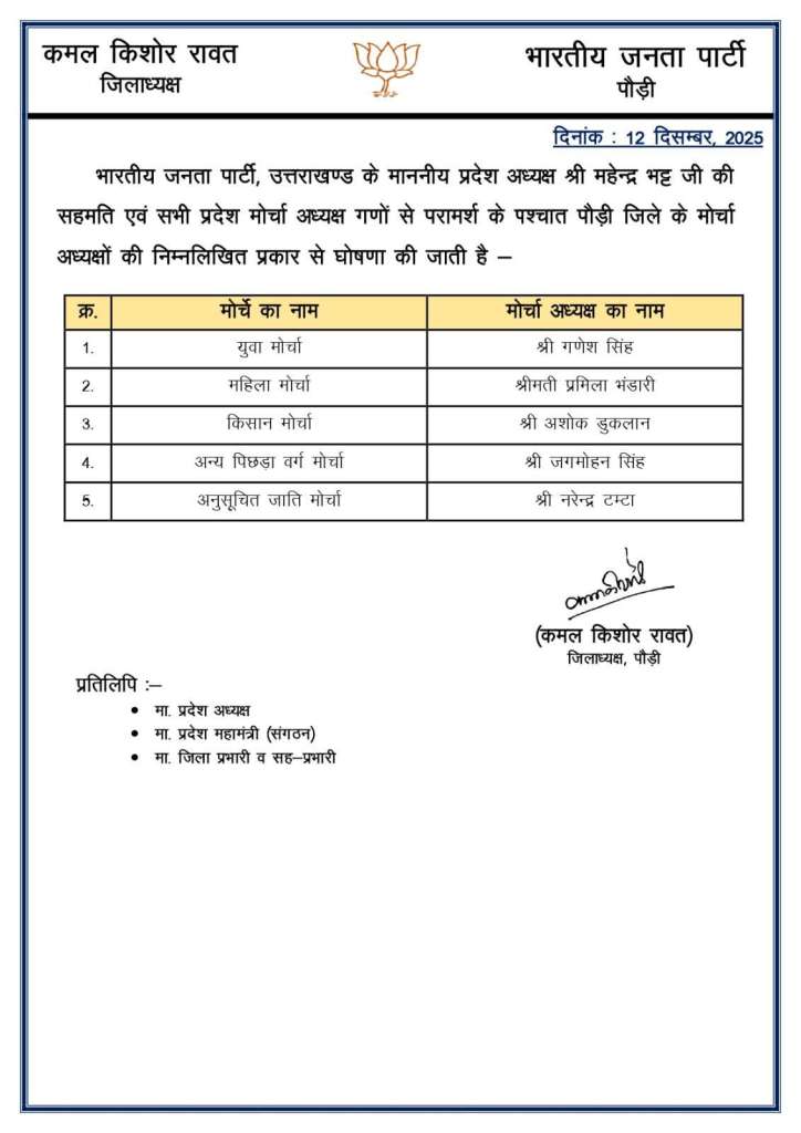 उत्तराखंड में भारतीय जनता पार्टी (BJP) ने संगठनात्मक स्तर पर अहम निर्णय लेते हुए जिलों के मोर्चा अध्यक्षों की घोषणा कर दी है। यह निर्णय प्रदेश अध्यक्ष महेंद्र भट्ट की सहमति से और सभी प्रदेश मोर्चा अध्यक्षों से व्यापक परामर्श के बाद लिया गया।