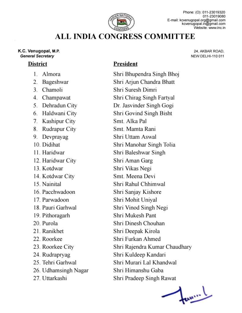 कांग्रेस ने उत्तराखंड के तमाम जिलों के जिला अध्यक्षों एवं महानगर अध्यक्षों की नियुक्ति की,पढ़ें नैनीताल यूएसनगर सहित इन जिलों में इन्हें मिली जिम्मेदारी…
