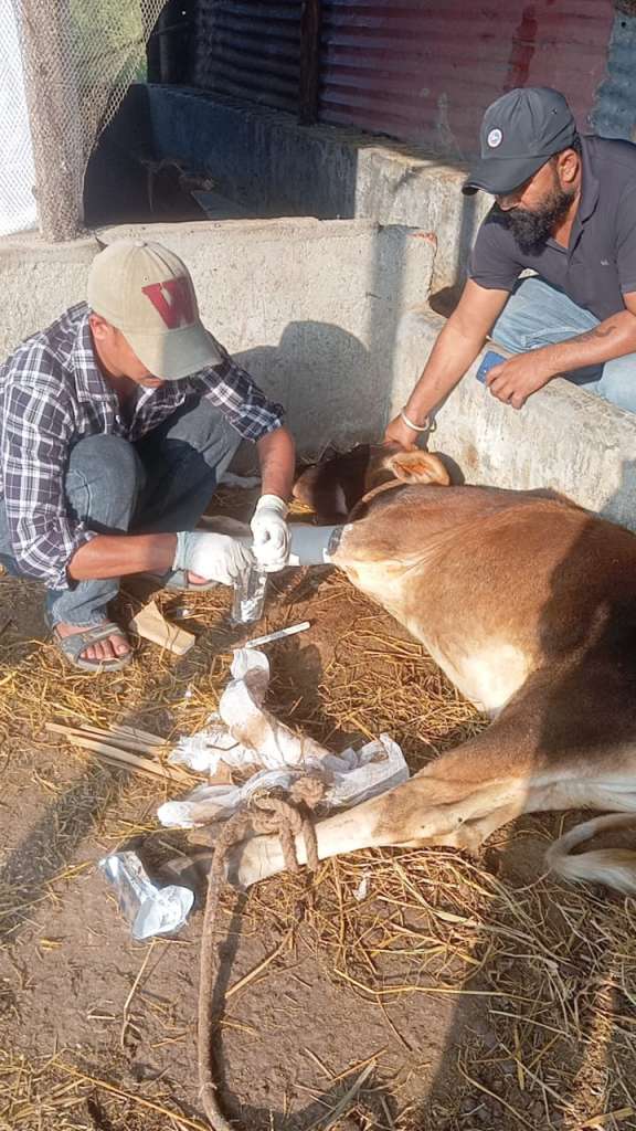 बनबसा – सड़क दुर्घटना में तड़प रही घायल गाय की सूचना पर गौसेवक घटना स्थल पर मौके पर पहुंचें जिसके बाद गौसेवकों द्वारा घायल गाय को महादेव गौसेवा उपचार केंद्र लाया गया। जहाँ पशु चिकित्सा अधिकारी के निर्देश पर चिकित्सा कर्मी एवं उपचार केंद्र संचालक नरेश विश्वकर्मा राष्ट्रीय बजरंगदल महामंत्री के सहयोग से घायल गाय का उपचार किया गया। प्राप्त जानकारी अनुसार दुर्घटना में गाय का एक गंभीर रूप से फ्रैक्चर हो गया, जिसका सकुशल उपचार किया।