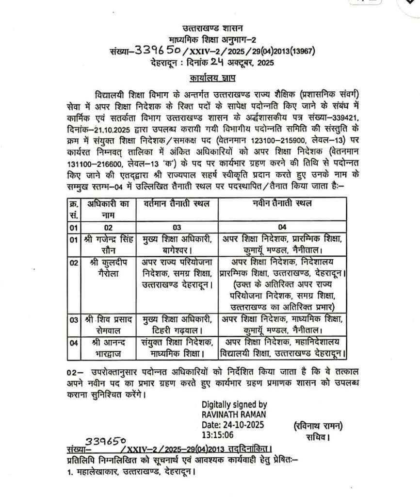 उत्तराखंड सरकार ने शिक्षा विभाग में बड़े स्तर पर तबादले किए हैं। शासन ने चार वरिष्ठ अधिकारियों की नई तैनाती करते हुए तत्काल प्रभाव से कार्यभार ग्रहण करने के निर्देश जारी किए हैं।शासन ने इसे लेकर आदेश जारी कर दिए हैं। आदेश के अनुसार, शिक्षा विभाग में कई अहम पदों पर बदलाव किए गए हैं। शासन की ओर से जारी किए आदेश के मुताबिक गंजन सिंह सोनी, जो अब तक मुख्य शिक्षा अधिकारी, बागेश्वर के पद पर कार्यरत थे, उन्हें अपर शिक्षा निदेशक (प्राथमिक शिक्षा), कुमाऊं मंडल, नैनीताल के रूप में तैनात किया गया है