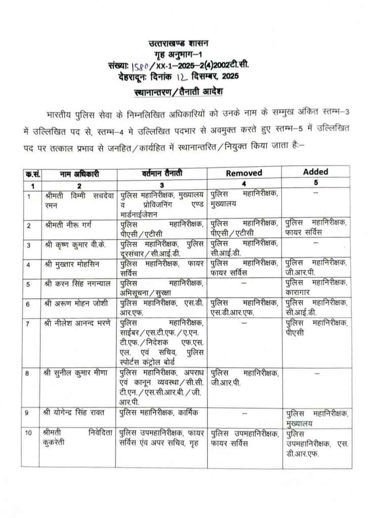 उत्तराखंड पुलिस में बड़ा फेरबदल!, IPS अधिकारियों के बंपर तबादले