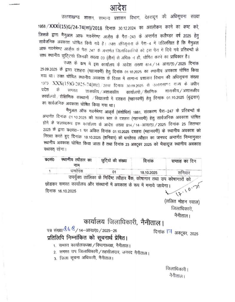 नैनीताल न्यूज़ :- जिलाधिकारी नैनीताल ललित मोहन रयाल ने जानकारी देते हुए बताया कि उत्तराखण्ड शासन, सामान्य प्रशासन विभाग, देहरादून के आदेश के अनुपालन में आगामी 18 अक्टूबर 2025 (शनिवार) को धनतेरस पर्व के अवसर पर जनपद नैनीताल के सभी शासकीय, अर्धशासकीय कार्यालयों, कोषागारों तथा उप कोषागारों में स्थानीय अवकाश घोषित किया गया है।इस संबंध में जारी आदेश में कहा गया है कि शासन द्वारा पूर्व में 01 अक्टूबर 2025 को महात्मा गांधी जयंती के स्थान पर स्थानीय अवकाश घोषित किया गया था, परंतु अब संशोधित आदेश के अनुसार 18 अक्टूबर 2025 (धनतेरस) को स्थानीय अवकाश रहेगा।धनतेरस पर्व पर अवकाश घोषित किए जाने से जिलेभर के सरकारी कार्यालय, कोषागार और संस्थान बंद रहेंगे तथा कर्मचारी अपने परिवारजनों के साथ त्योहार मना सकेंगे।