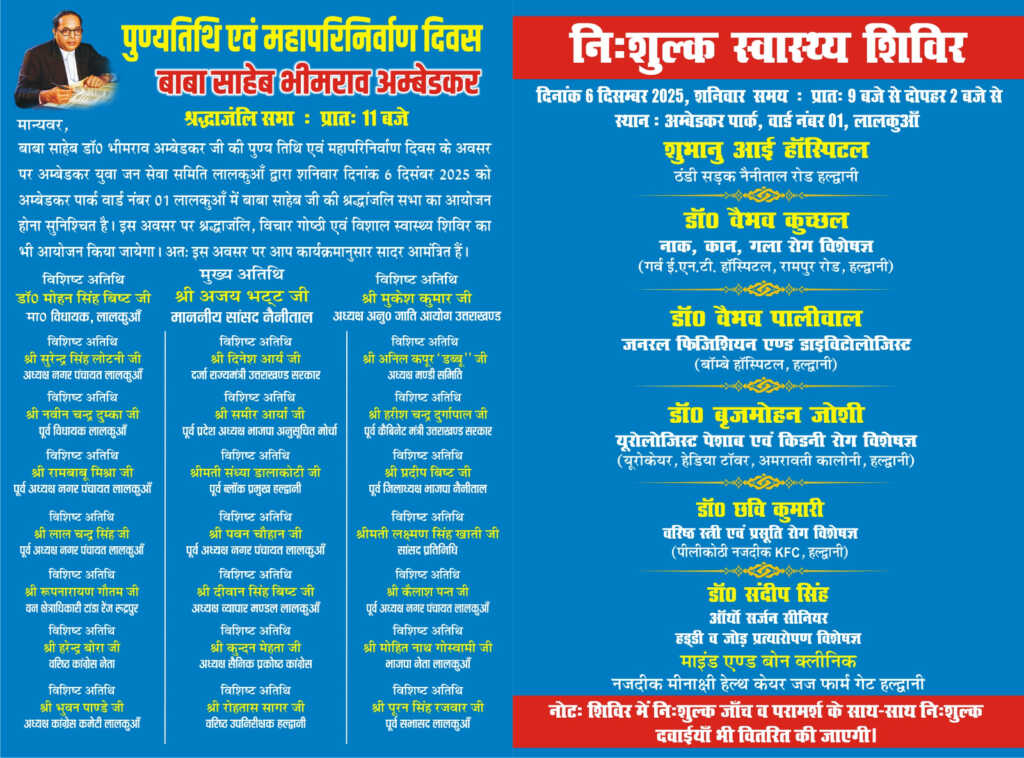 6 दिसंबर को बाबा साहब डॉ. भीमराव अंबेडकर की पुण्यतिथि एवं महापरिनिर्वाण दिवस पर इस बार कुछ अलग और भव्य देखने को मिलेगा। अंबेडकर पार्क में सुबह 9 बजे से दोपहर 2 बजे तक विशाल स्वास्थ्य शिविर लगाया जा रहा है, जिसमें हल्द्वानी के कई प्रतिष्ठित अस्पतालों के वरिष्ठ चिकित्सक अपनी सेवाएँ देंगे। खास बात यह है कि सभी जांचें और दवाइयाँ पूरी तरह निशुल्क होंगी, जबकि आंखों की हाईटेक मशीनों से विशेष जांच की व्यवस्था भी की गई है। जांच में आंखों की जांच, ईसीजी, वीपी, शुगर, थाइरॉइड, सहित कई जांच निशुल्क होगी।कार्यक्रम में श्रद्धांजलि गोष्ठी भी आयोजित होगी, जिसमें नैनीताल के लोकप्रिय सांसद अजय भट्ट, उत्तराखंड अनुसूचित जाति आयोग के अध्यक्ष मुकेश कुमार, लालकुआँ विधायक डॉ. मोहन सिंह बिष्ट सहित क्षेत्र के कई जनप्रतिनिधि और समाजसेवी मौजूद रहेंगे। सभी अतिथि बाबा साहब की प्रतिमा पर पुष्प अर्पित कर अपनी श्रद्धांजलि देंगे। जनसभा को संबोधित करने की भी तैयारी है।यह पूरा आयोजन अंबेडकर युवा जन सेवा समिति लालकुआँ द्वारा किया जा रहा है। समिति के अध्यक्ष मुकेश कुमार और कार्यक्रम संयोजक उदय वीर सिंह ने लोगों से अपील की है कि अधिक से अधिक संख्या में पहुँचकर स्वास्थ्य शिविर का लाभ लें। समिति के अनुसार सभी तैयारियाँ पूरी कर ली गई हैं और 6 दिसंबर को पार्क में बड़ी संख्या में लोगों की उपस्थिति की उम्मीद की जा रही है